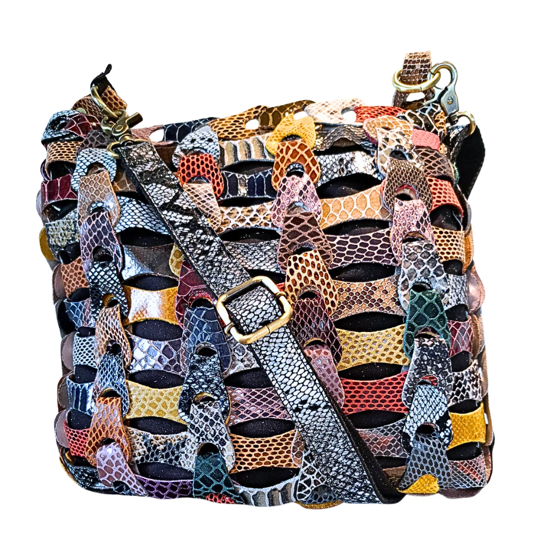 Taske til skulder: Style Aida i multifarve af slangepræget læder. Klassisk håndflettet skuldertaske