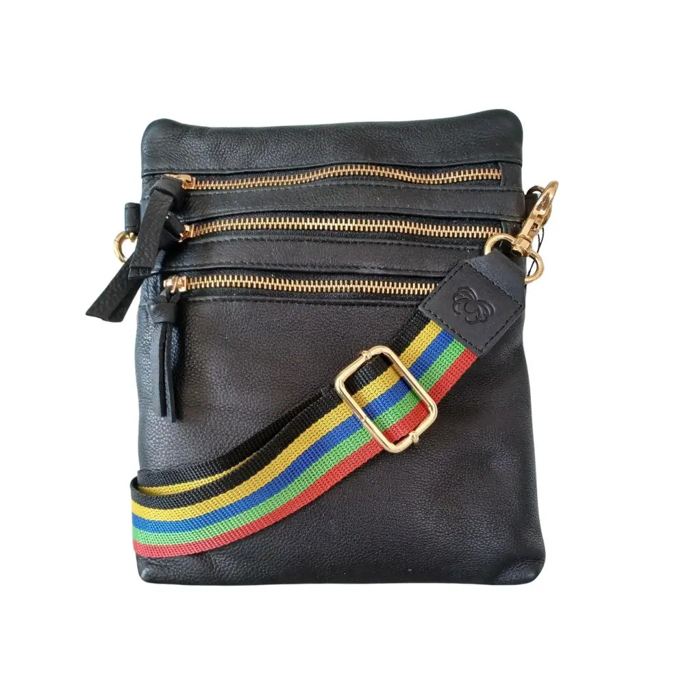 Superflot multifarvet justerbar taskerem. Gør din taske 10-20 år yngre med et snuptag. Prøv at skifte den lidt kedelige ensfarvede læderrem ud med cool bred skulderrem i hotte, flotte farver. I dag, hvor du kan mixe alle typer materialer og farver på kryds og tværs, er guitarremmen opstået, som et fantastisk tasketilbehør. Effekten ved at skifte rem er kæmpestor. En såkaldt "mormor taske", bliver til en hot, trendy og iøjnefaldende taske på et splitsekund.