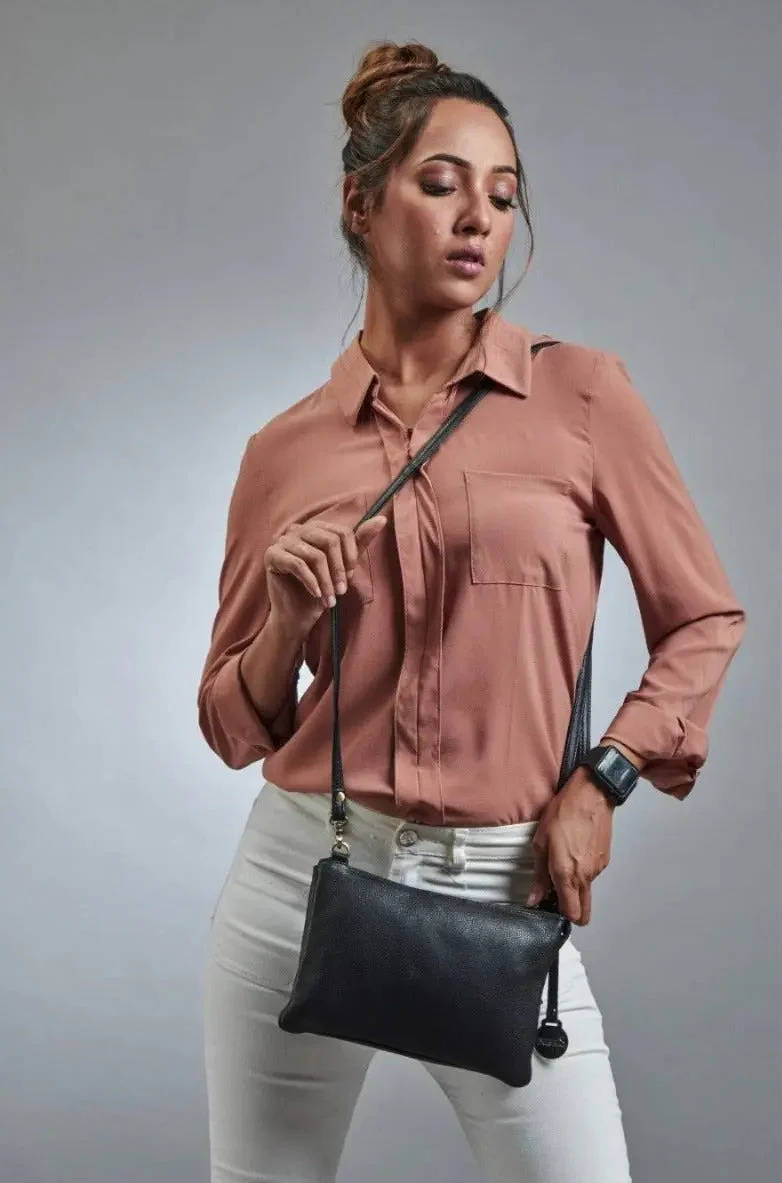 Style Camina i sort. Clutch, crossbody- og skuldertaske i læder med to indvendige hovedrum