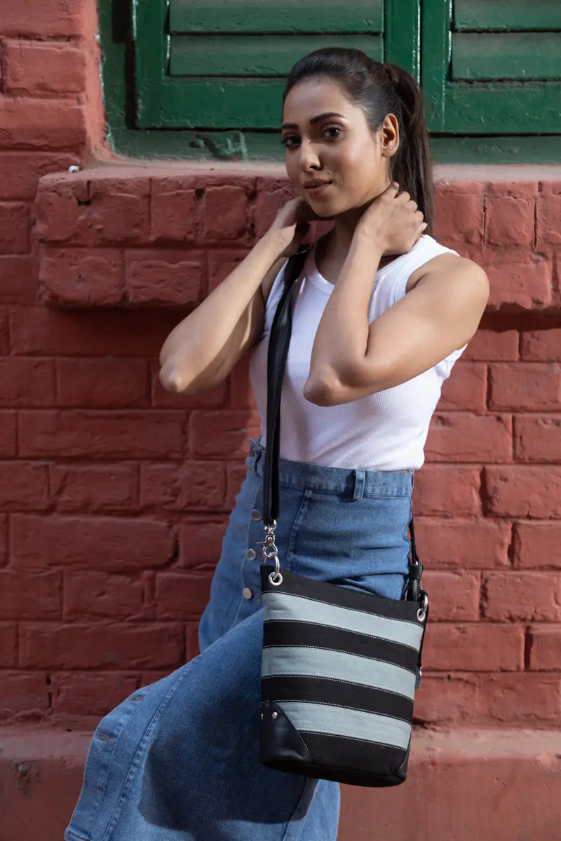 Style Kenya i sort/grå stribet kanvas. Fantastisk crossbody / skuldertaske i kraftig, smuk kanvas med detaljer i læder