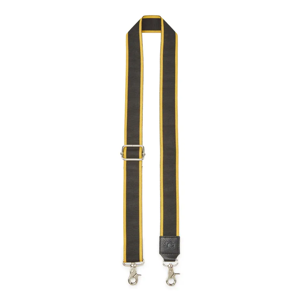 Denne smukke taskerem, style N12, i sort m. gule kanter kommer med store flotte karabinlåse i sølv. Remmen er produceret i nylon, som er et særdeles holdbart materiale og derfor kan bære de nødvendige kilo i tasken.
