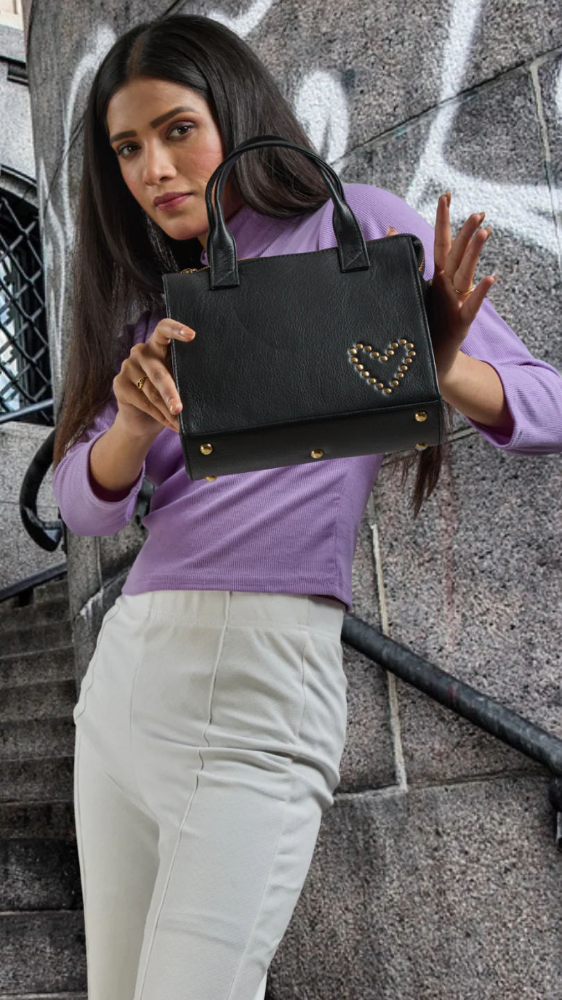 Style Onyx i sort med hjerte af nitter i guld. Mindre og smuk kombineret hånd-, skulder-, og crossbodytaske