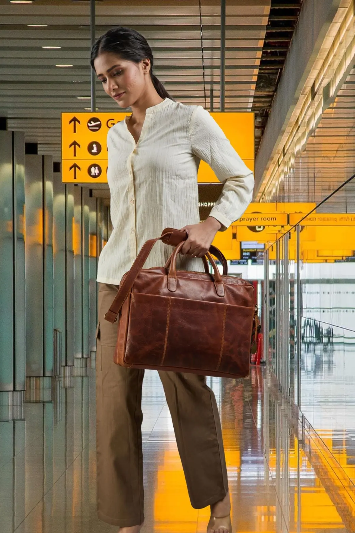 Style Ocean (kun ét stk. på lager). Eksklusiv cognacfarvet rejse- og arbejdstaske i flot kvalitetslæder m. vintage look
